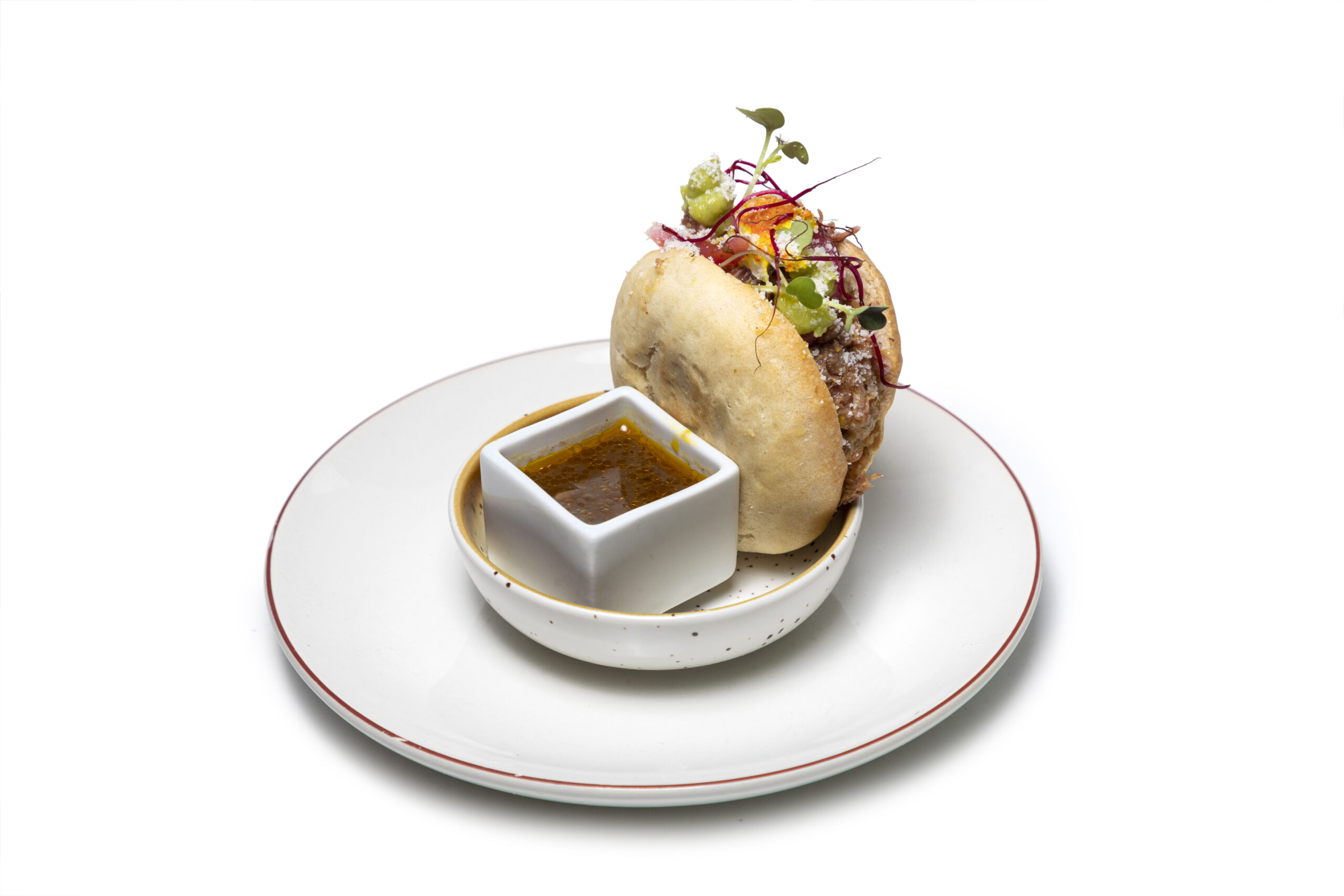 Nubes de pan casero a nuestro estilo con carrilleras de ternera y un toque de nuestra salsa canaria.