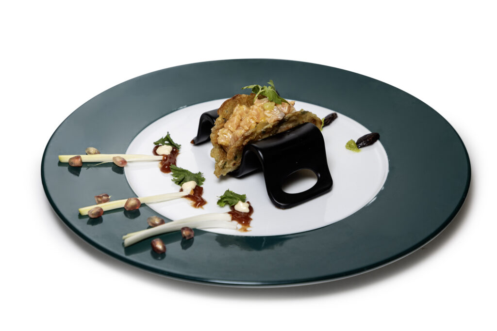 Ekotalo con coulis de Piña asada, rúcula, pollo a la vietnamita, salsa de curry rojo, polvo de cacahuetes y cebollino.