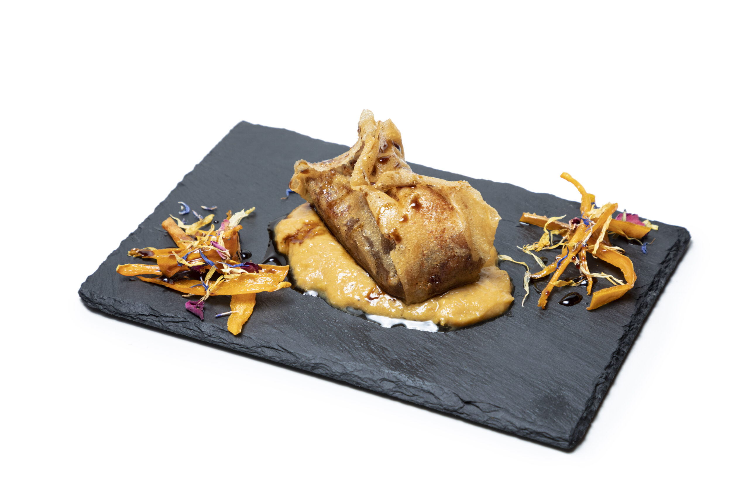 Brik de pata de cuto rellena de carrillera en su jugo con pure, boniato y reducción de PX.