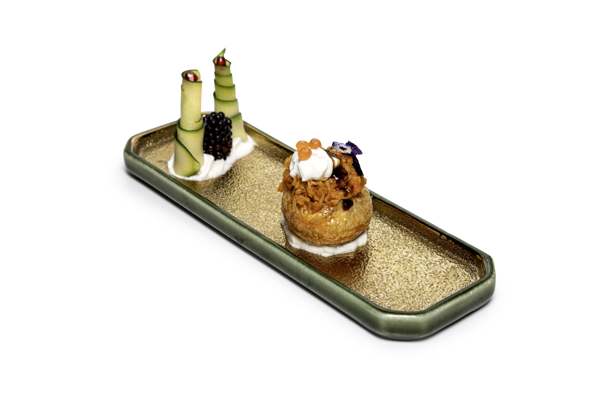 Bola de maíz crujiente rellena de parmentier de patata con queso crema, txangurro, Ikura y salsa teriyaki.